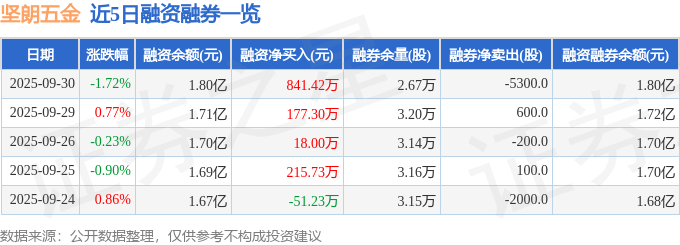 坚朗五金融资融券信息显示,融资方面,当日融资买入1732.01万元,融资偿还890.59万元,融资净买入841.42万元,连续3日净买入累计1036.72万元。融券方面,融券卖出500.0股,融券偿还5800.0股,融券余量2.67万股,融券余额58.02万元。融资融券余额1.8亿元。